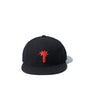 フロントとバックにオレンジの刺繍でロゴを入れたキャップ。